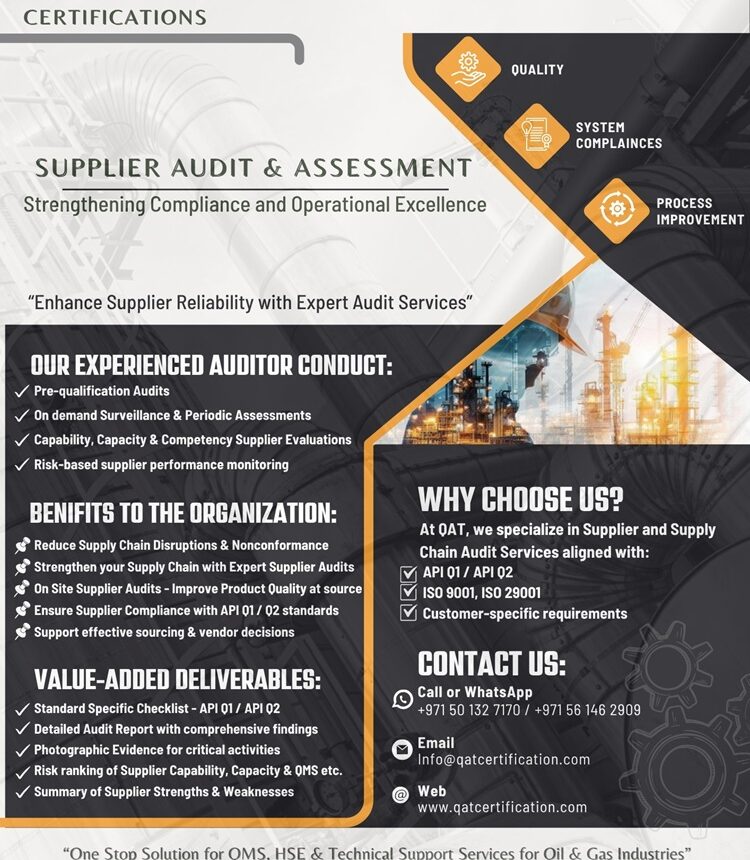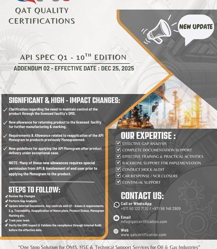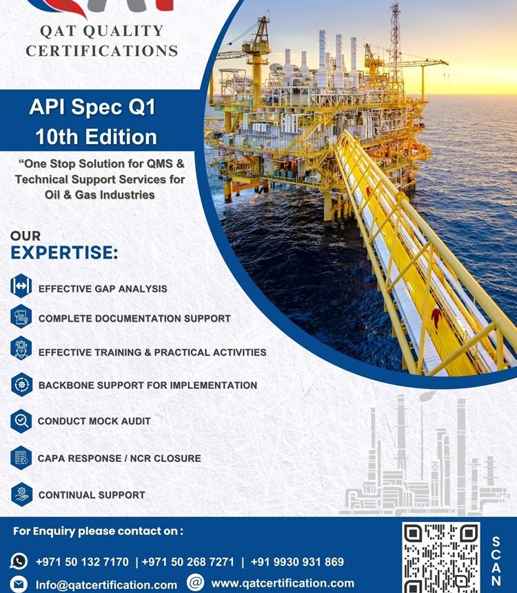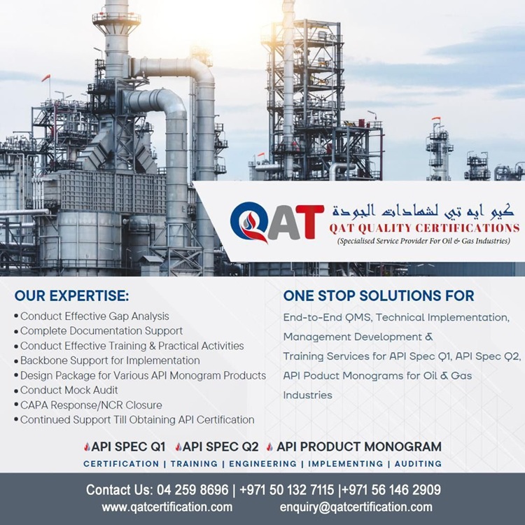 QAT QUALITY CERTIFICATIONS PROVIDES ONE STOP SOLUTIONS FOR END TO END ENGINEERING SERVICES FOR API Spec Q1, API Spec Q2, API PRODUCT MONOGRAM’S, ASME Certifications, ISO Audit & Certifications, Third Party Inspection Services, Supplier Audits and Various Training programs.
